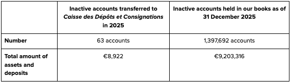 As per Article L. 312-19 of the French Monetary and Financial Code, Lydia Solutions is required to publish annually the number of inactive accounts held in its books, the total amount of deposits and assets registered on these accounts, as well as the number of accounts and the amount of assets transferred to Caisse des Dépôts et Consignations.
