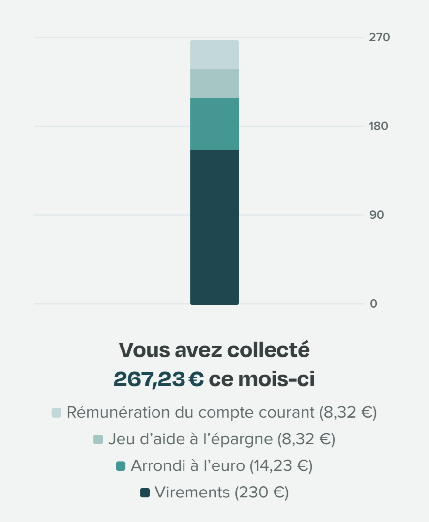 À la fin du mois, lors de la répartition de sa collecte mensuelle, le client pourra visualiser le montant total épargné grâce aux centimes mis de côté à chaque transaction.